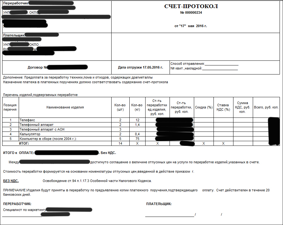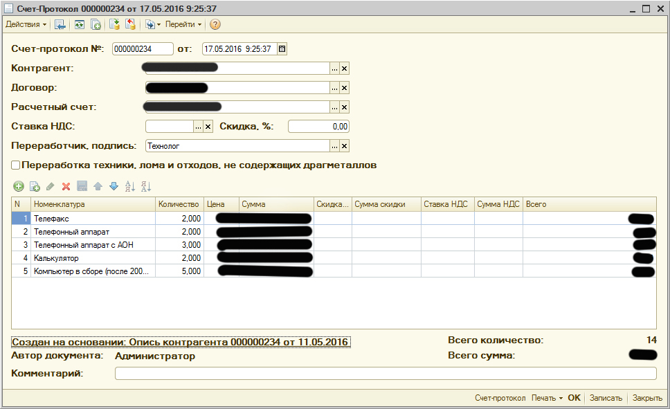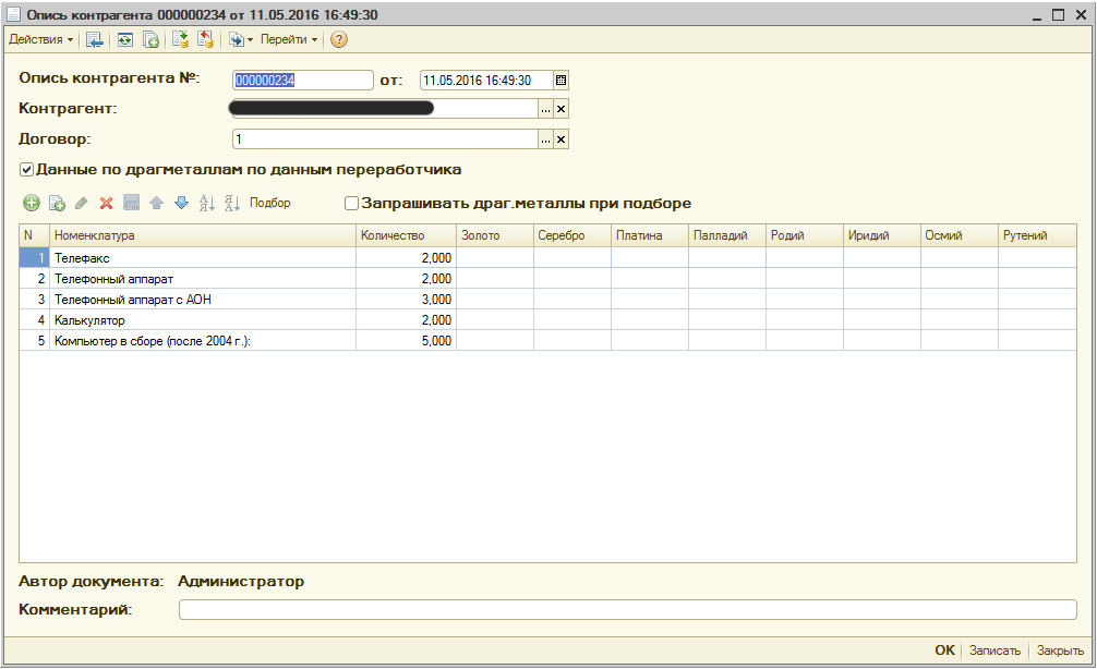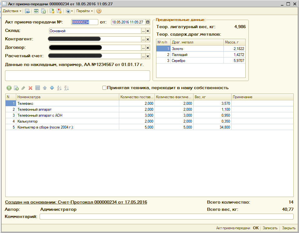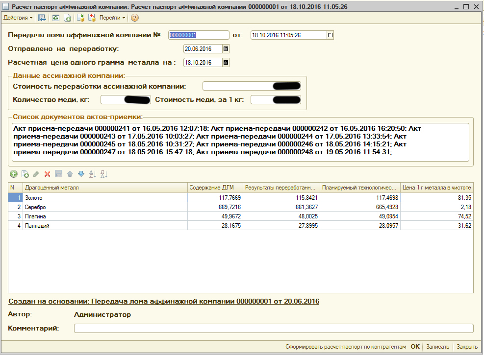 Задача: Нужна программа, позволяющая вести учет для переработки электронного и электронно-технического оборудования. Программа должна позволять выписывать цепочку документов: "Опись контрагента" - > "Счет-протокол" - > "Акт приема-передачи" - > "Отпуск в производство" - > "Акт первичной переработки" - > "Акт выполненных работ" - > "Расчет паспорт". Специфика в том, что предприятие собирает оборудование от контрагентов, перерабатывает в лом до определенного объема по предполагаемым данным (теоретическое содержание драгоценных металлов в ломе), который затем сдается на переработку в аффинажную компанию. Аффинажная компания в течение полугода перерабатывает лом и присылает фактический результат. По данным фактического результата формируются расчет-паспорта.