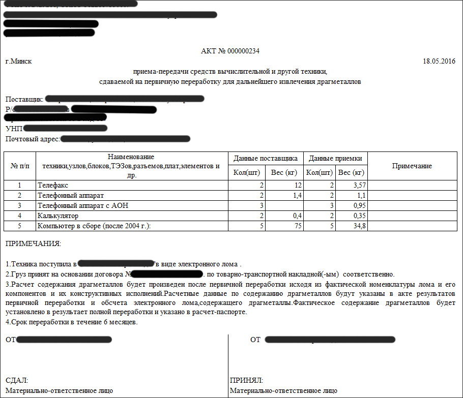 В течение полугода аффинажная компания присылает фактический результат переработки. Результаты оформляются документом расчет-паспорт аффинажной компании.