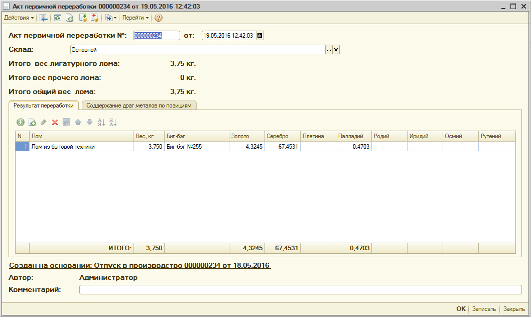 Вышеописанные этапы повторяются множество количество раз, пока перерабатывающая компания (заказчик разработанной конфигурации) не наберет минимально необходимое количество лома, содержащий драг.металлы, для отправки в аффинажную компанию. Технолог предприятия формирует специальный документ передача лома в аффинажную компанию. Выписывается ТТН и лом отправляется на обработку в аффинажную компанию.