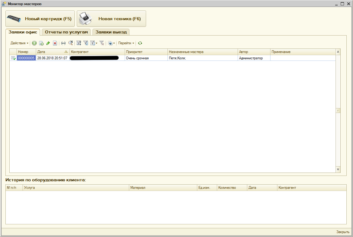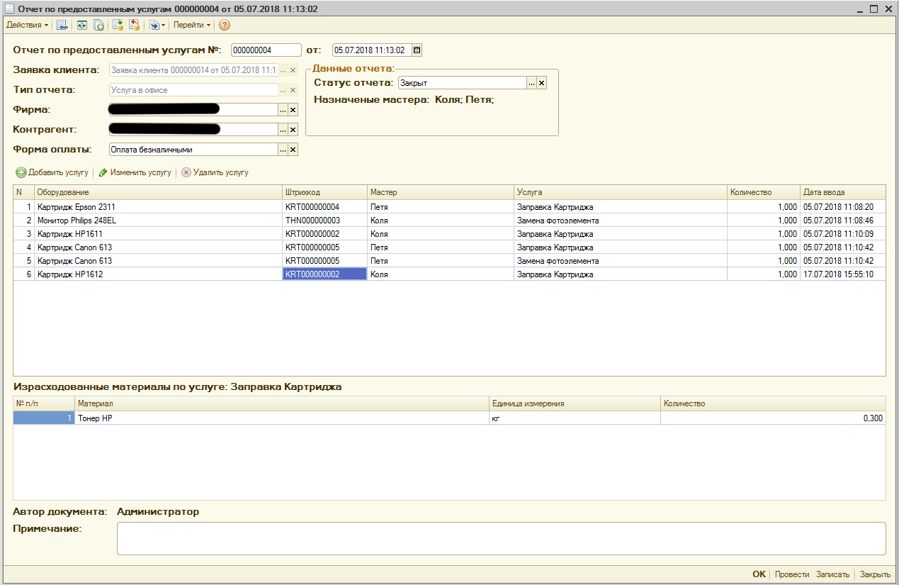 Задача: Заказчику нужна была программа, которая бы позволяла вести учет заправки картриджей и ремонта оргтехники. Ремонт осуществляется как в офисе компании, так и на выезде мастерами. Предъявляемые требованиями к программе были: