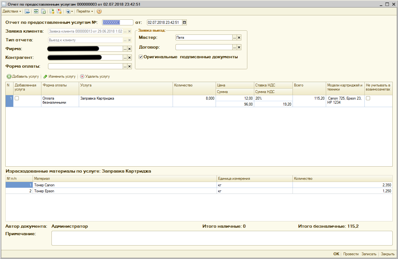 Документ "Отчет по оказанным услугам" может быть двух типов "Услуга в офисе", "Выезд к клиенту". Документ выглядит следующим образом: