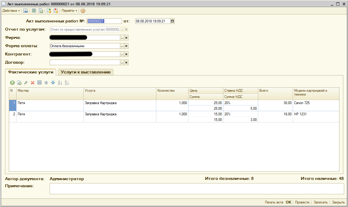 Документ "Акт выполненных работ" выглядит следующим образом.