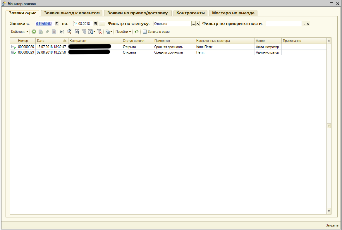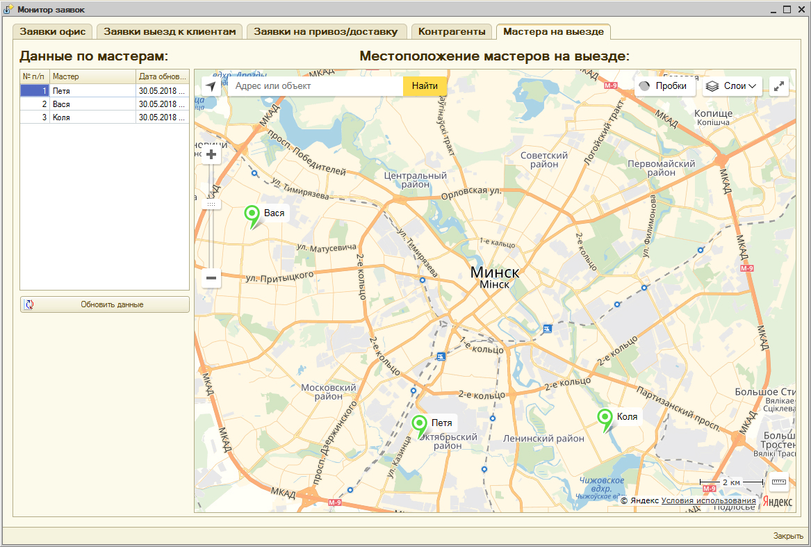 Для администратора было разработано рабочее место, где все заявки сгруппированы по видам: "Заявки офис", "Заявки выезд", "Заявки на доставку/привоз техники", так же виден весь список контрагентов и есть закладку с картой, где показаны все мастера на выезде. Рабочее место администратора выглядит так: