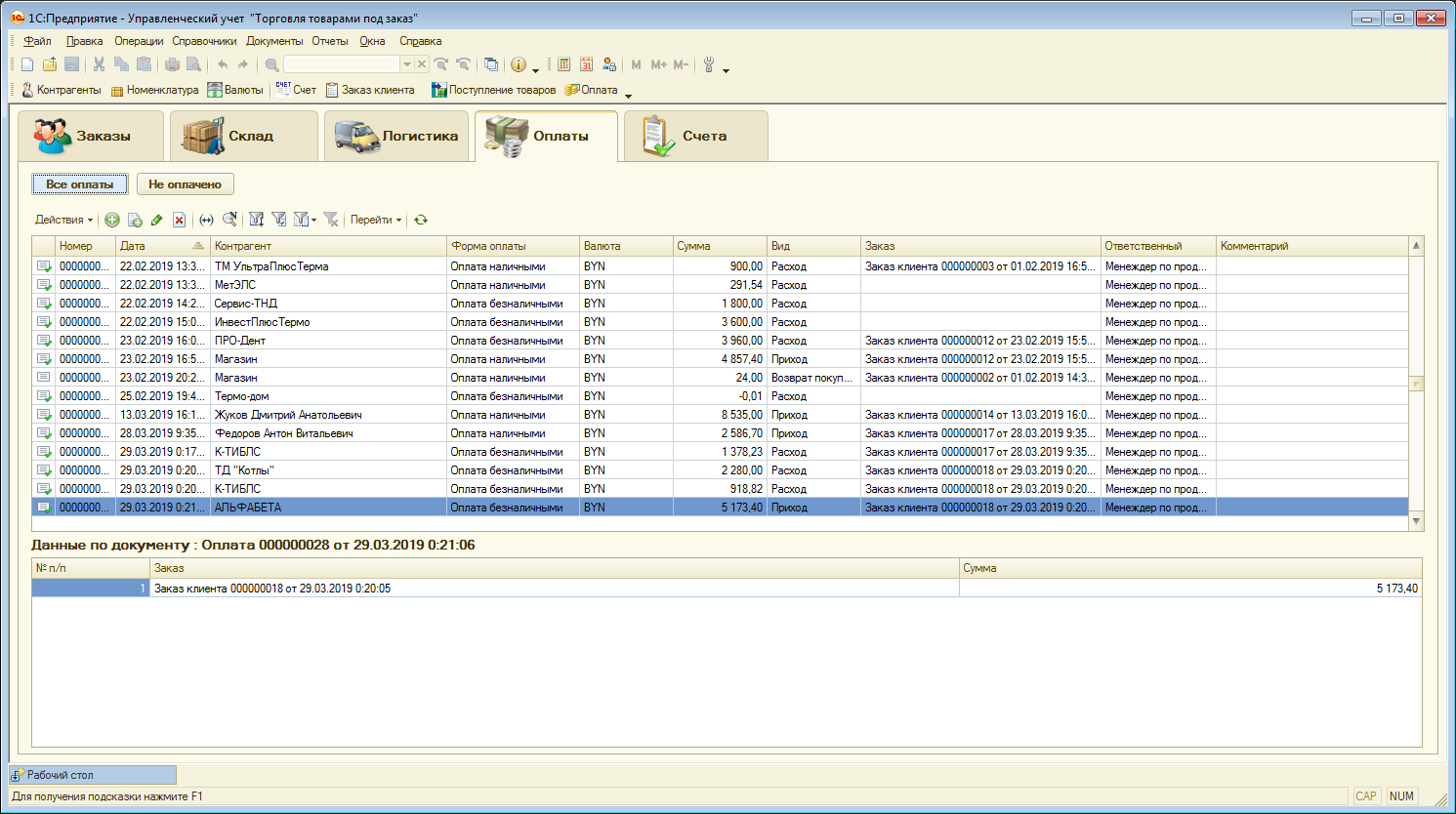 Четвертый раздел "Оплаты" состоит из двух подразделов: "Все оплаты" и "Неоплаченные". В подразделе "Все оплаты" показаны документы оплаты поставщикам и оплаты от клиентов. В подразделе "Неоплаченные" показаны товары, которые необходимо оплатить поставщикам.