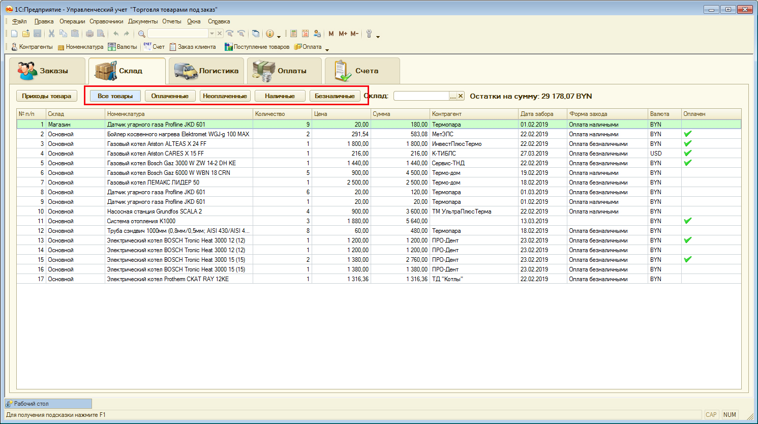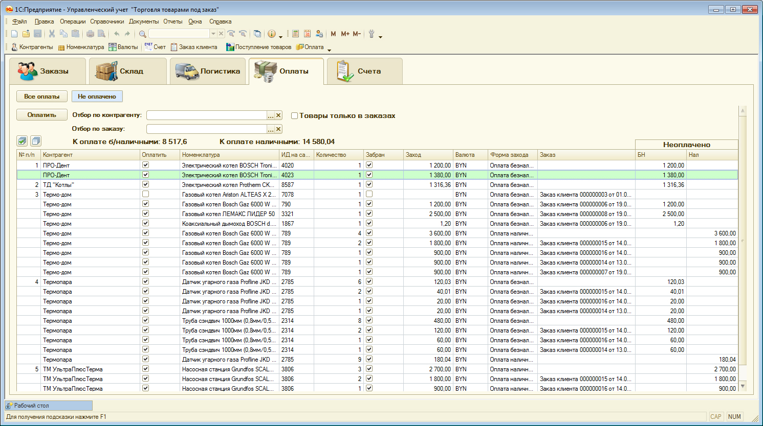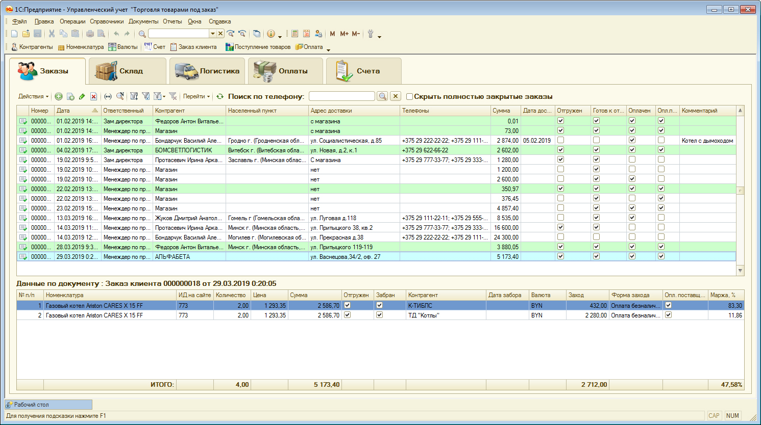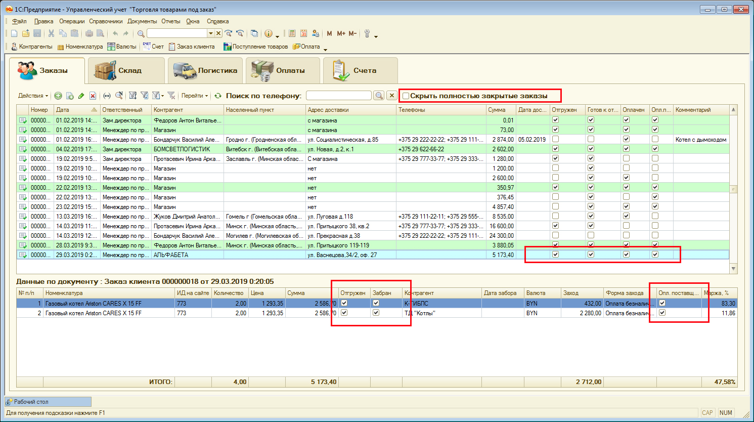 Первый раздел "Заказы" показывает все текущие заказы. Поскольку основным требованием была возможность продавать товар под заказ у поставщика(товара в наличии на складе у компании нет), то по каждому заказу выводится информация по 4 статусам заказа: "Весь товар отгружен"(товар отгружен клиенту), "Весь товар забран"(товар забран у поставщика и помещен на склад компании), "Весь товар оплачен клиентом", "Весь товар оплачен поставщику". Если у заказа все 4 статуса одновременно подтверждены - тогда он подсвечен зеленым цветом в списке заказов. Также доступна опция скрыть все полностью готовые заказы. Внизу раздела отображена подробная информация по каждому товару из заказа, который активный в списке заказов (подсвечен синей строкой). Для каждого товара из заказа показывается 3 статуса: "Товар отгружен", "Товар забран", "Товар оплачен поставщику". Возможность показывать последний статус по товару реализована учетом кредиторской задолженности по товарам, а не по документам как в большинстве других конфигураций 1С.