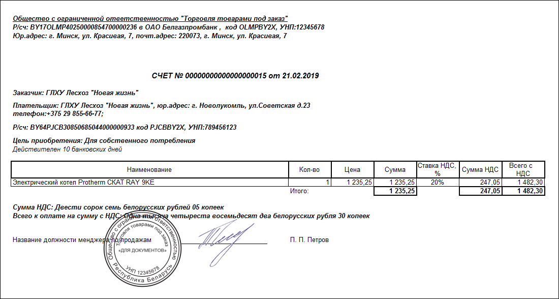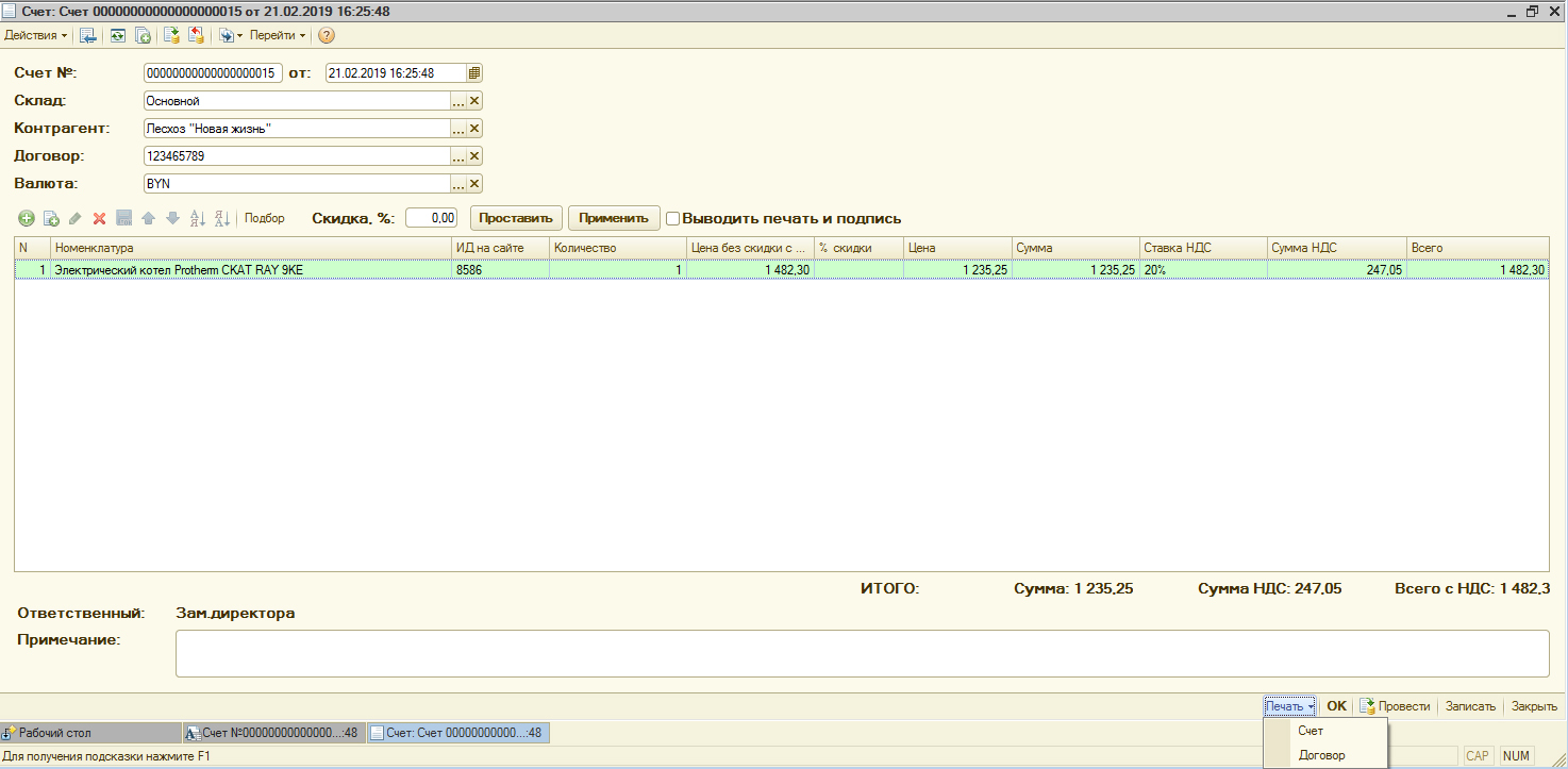 Документ "Счет" выглядит следующим образом: