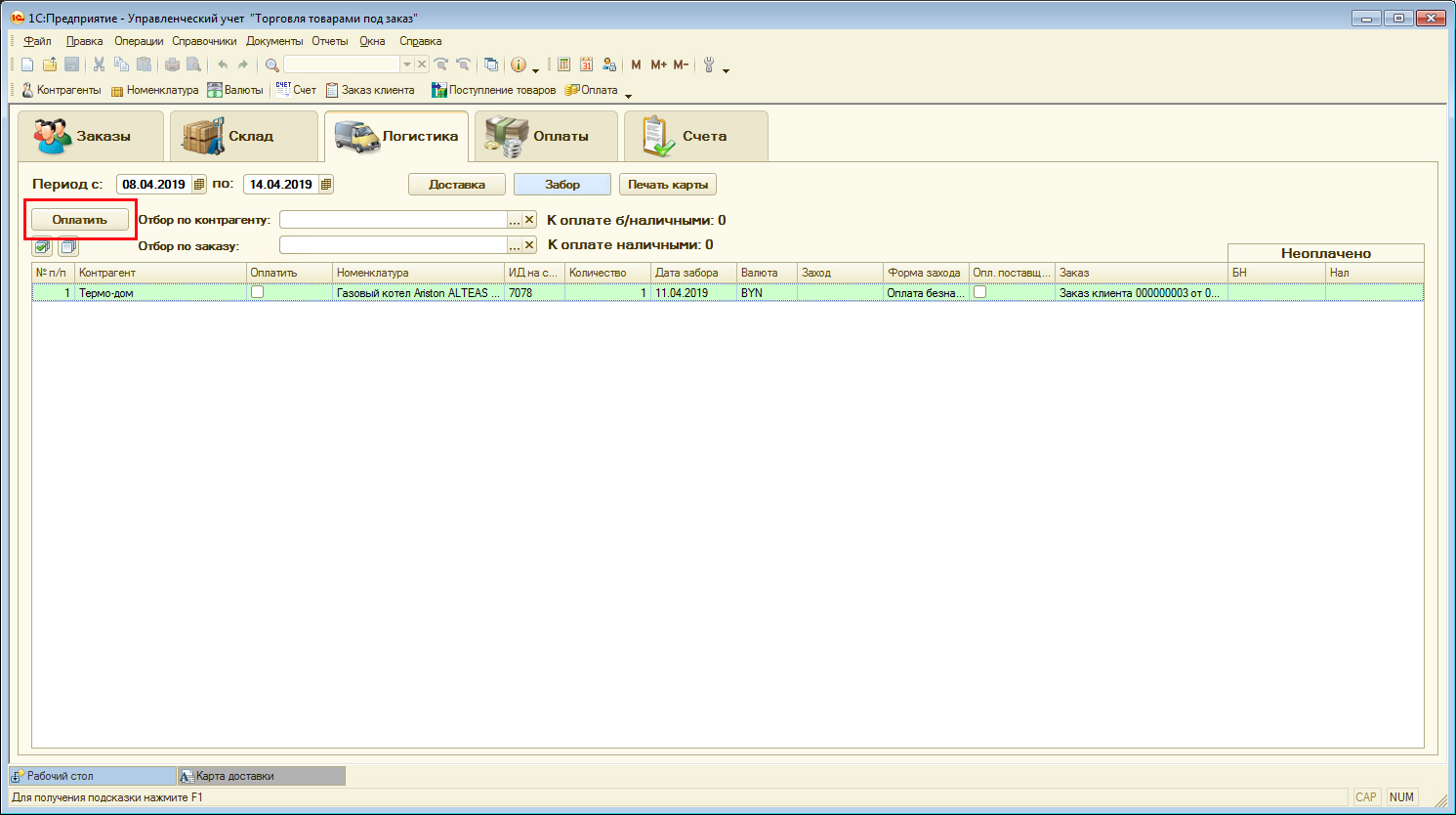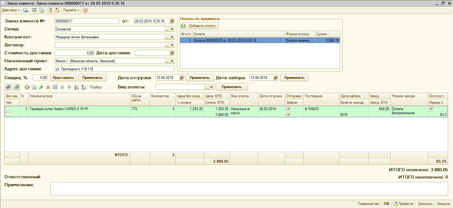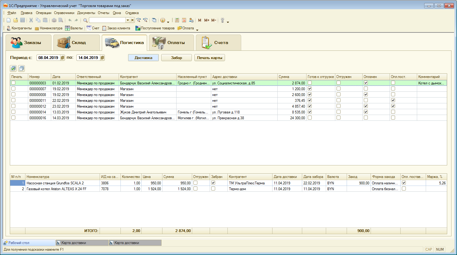 Документ "Заказ клиента" позволяет подбирать товар в двух режимах: когда товар есть на складе и когда его нет. Если товара нет, тогда менеджер проставляет дату забора его у поставщика и сумму покупки. Сам документ и окно подбора выглядят следующим образом: