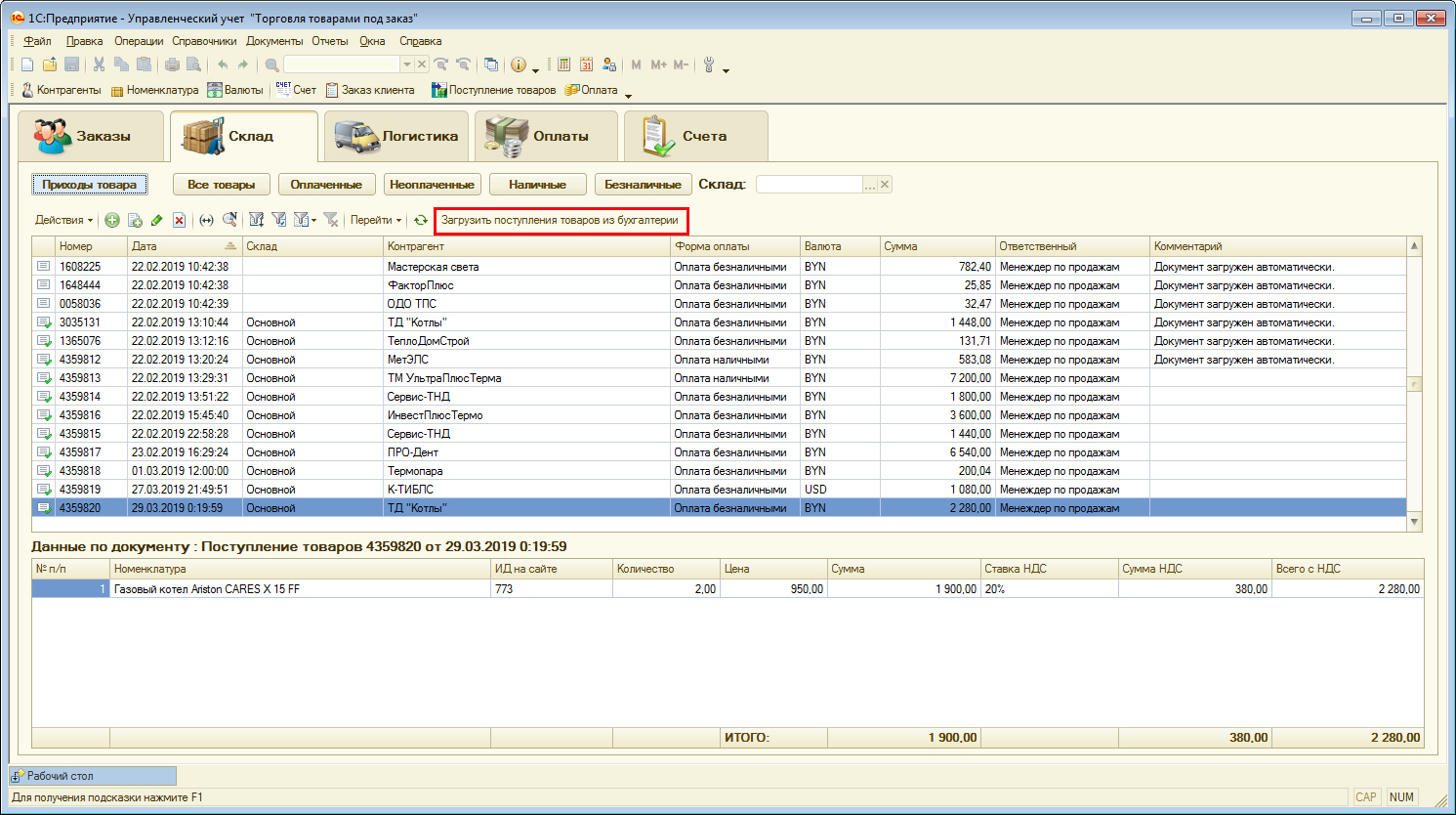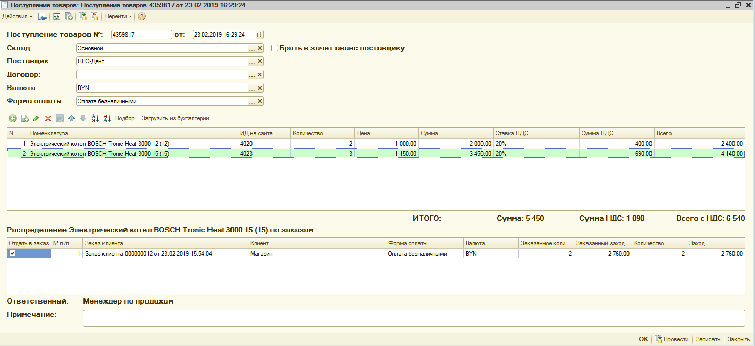 - 2) При поступлении товаров программа должна автоматически распределять приходуемый товар по заказам;