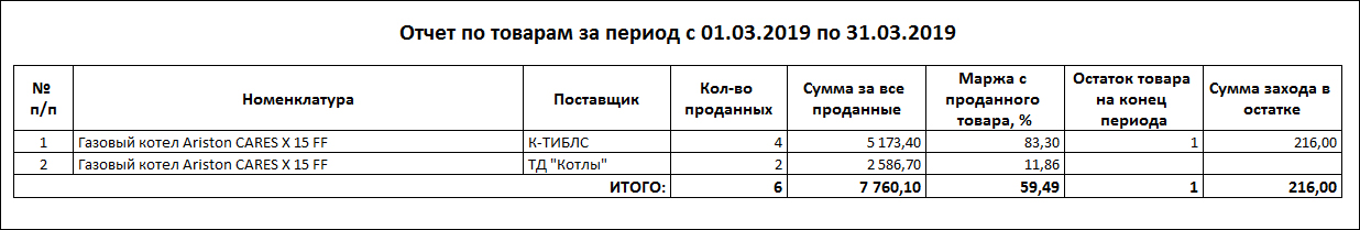 Отчет "Отчет по товарам" выглядит следующим образом: