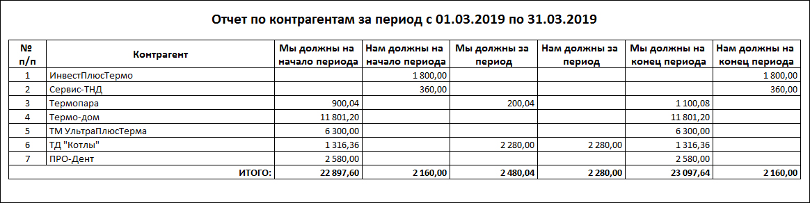 Отчет "Отчет по контрагентам" выглядит следующим образом: