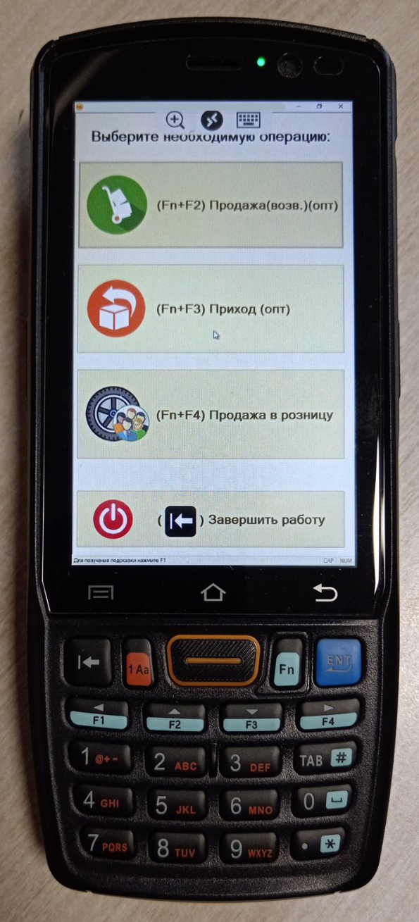 Каждая кнопка переводит ТСД в соответствующий режим работы. Принцип работы режимов "Продажа (возврат) опт" и "Приход (опт)" идентичны - после выбора режима необходимо отсканировать штрихкод документа