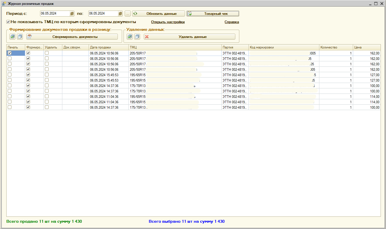 Задача: Компания занимается продажей шин в опт и розницу. Понадобилось решение, позволяющее вести учет кодов маркировки точно и максимально просто, без лишних трудозатрат персонала. Система учета должна позволять вести поступление, продажу в опт и розницу, возврат кодов маркировки.