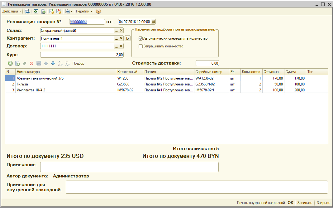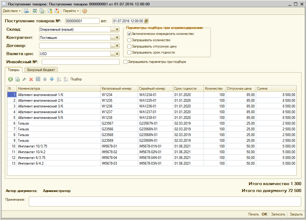 Основные документы в конфигурации "Поступление товаров", "Реализация товаров", "Возврат товаров" поддерживают два режима работы - ручной ввод данных и с помощью сканера штрихкодов. Поскольку используется QR-штрихкод, то при вводе с помощью сканера штрихкодов, программа сразу определяет артикул товара, сам товар, серийный номер, количество в упаковке и срок годности.