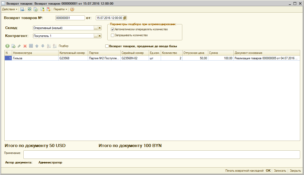 В документе "Возврат товаров" при использовании сканера штрихкодов программа автоматически находит нужную реализацию товаров, автоматически заполняет количество, цену товара, курс, документ реализации.