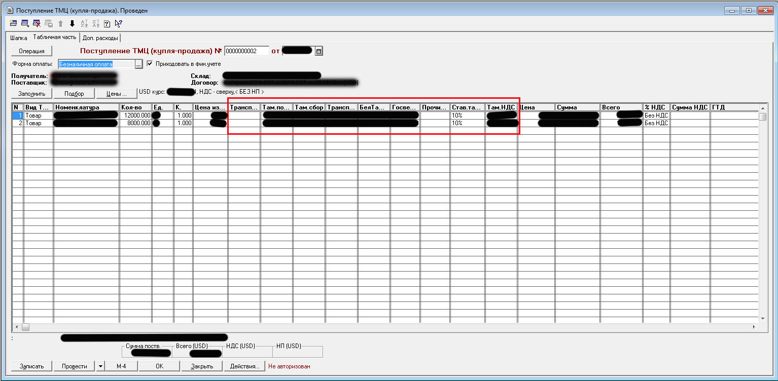 В качестве примера, опишем обмен документа "Поступление товаров". Заказчик импортирует товары, растормаживает их и несет другие затраты, связанные с доставкой товаров в РБ. Для этого в ТиС был доработан документ "Поступление ТМЦ":
