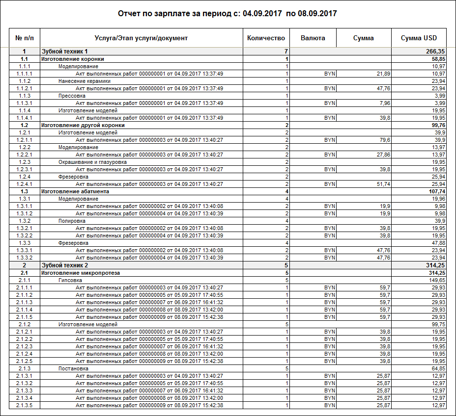 В документе "Прейскурант" задаются цены как для клиентов в разрезе форм оплат, так и для техников - т.е. какова цена работы техника для каждой услуги, чтобы потом посчитать зарплату технику. Документ "Прейскурант" выглядит следующим образом: