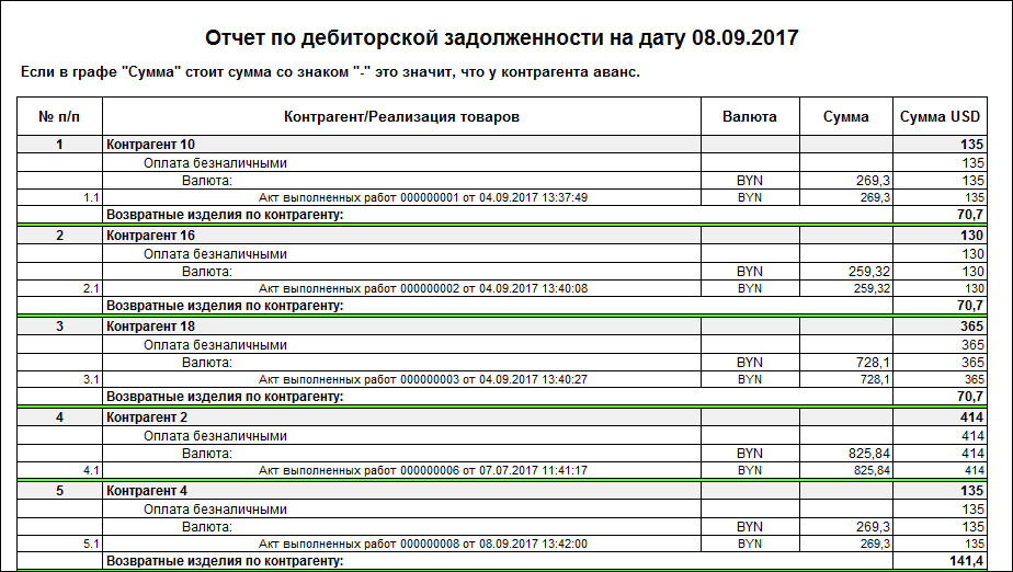 Отчет "Дебиторская задолженность" выглядит следующим образом: