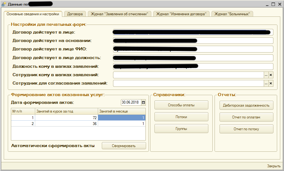 Задача: Необходимо было создать модуль для учета дебиторской задолженности в текущей программе 1С. Штатный учет дебиторской задолженности не подходил клиенту, потому что оплата оказываемых услуг контрагентами производится согласно графика платежей, установленным при заключении договора. График платежей индивидуальный и может быть как 1 платеж в год, так и 2,3,4,6,8 или 10 платежей. Так же необходимо автоматически формировать акты оказанных услуг по всем контрагентам в зависимости от количества занятий в месяц.